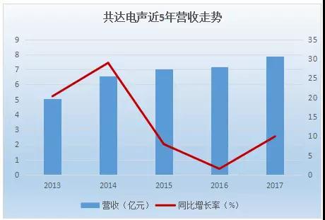 事實上,縱觀共達(dá)電聲近幾年的業(yè)績狀況,可謂是非常慘淡。從2013年到2017年,其營收分別為:5.07億元、6.54億元、7.05億元、7.16億元、7.87億元;其凈利潤分別為:0.14億元、0.24億元、0.19億元、0.18億元、-1.75億元。
