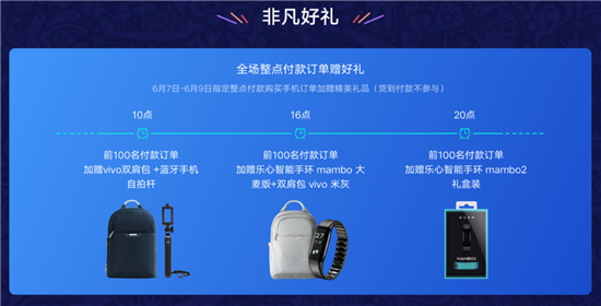 值得一提的是,在vivo官方商城還有指定機(jī)型整點購機(jī)加送好禮活動:當(dāng)日10點前100名付款訂單加贈vivo雙肩包和藍(lán)牙手機(jī)自拍桿;16點前100名付款訂單加贈樂心智能手環(huán)mambo和vivo雙肩包;20點前100百名付款訂單加贈樂心智能手環(huán)mambo2禮盒裝。