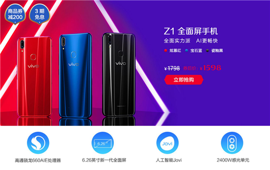 vivo Z1采用新一代全面屏設(shè)計,屏占比高達(dá)90%,3D炫彩流光機(jī)身同時搭載了驍龍660 AIE處理器以及4GB+64GB存儲組合價格僅為1798元。在618期間,購買vivo Z1可領(lǐng)取200元優(yōu)惠券,實際僅需1598元即可入手,可謂超值。