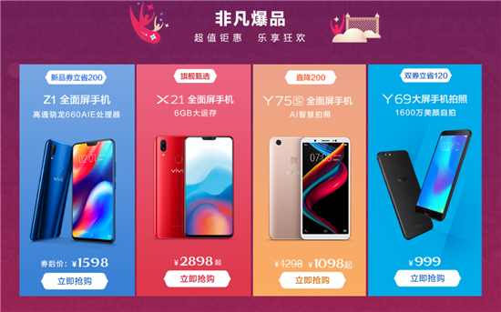 除了這兩款產(chǎn)品之外,還有眾多的熱銷單品值得購買。其中就有vivo上半年新出的旗艦vivo X21,618的預(yù)訂價只要2898,除此之外還贈送禮包,加上6期的免息。同樣,X21i等也有相對應(yīng)的優(yōu)惠力度,任君選擇。再者,之前的Y系列手機(jī),例如vivo Y75S直降200元,且備貨相當(dāng)充足,要多少有多少,總有一款能滿足你。
