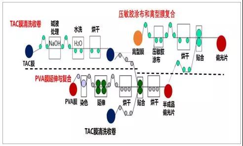 偏光片碘系和濕法拉伸工藝流程示意圖: TAC 膜清洗, PVA 膜延伸與復(fù)合,壓敏膠涂布和離型膜復(fù)合