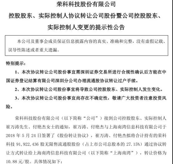 榮科科技公告表示,公司接到通知,公司實際控制人崔萬濤、付艷杰已經(jīng)簽署了《解除一致行動協(xié)議》。將合計持有的榮科科技9192.24萬股轉(zhuǎn)讓給上海南灣,占上市公司股份總額的27.15%,轉(zhuǎn)讓價格為10.88元/股,經(jīng)協(xié)商后合計總價10億元。上海南灣將成為上市公司控股股東,王迅及其一致行動人將成為上市公司實際控制人。