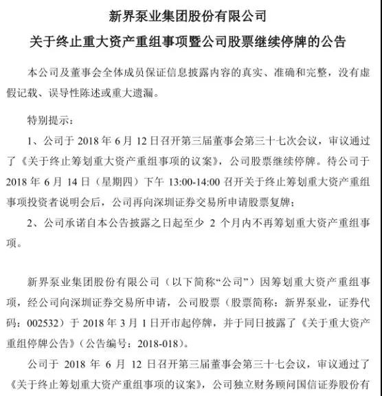 新界泵業(yè)表示,本次重大資產(chǎn)重組程序啟動后,公司及相關(guān)各方進行了協(xié)調(diào)磋商,積極推進本次重大資產(chǎn)重組的各項相關(guān)工作,公司股票停牌至終止本次重大資產(chǎn)重組決議期間,公司與交易對方反復(fù)溝通與磋商,交易各方未能就交易方案的重要條款達成一致意見,公司決定終止籌劃本次重組事項。