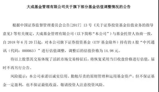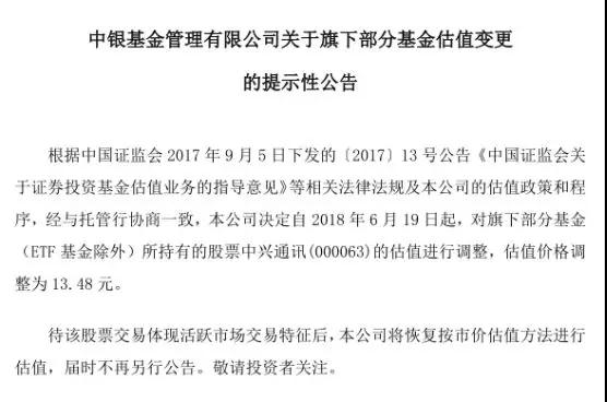 而在此期間,多家基金公司對中興通訊股票的估值進一步調(diào)整,總體是進一步下調(diào)。部分基金已將中興通訊估值下調(diào)至12.02元。富國基金近日公告稱,自2018年6月20日起,對旗下基金持有的“中興通訊”股票進行估值調(diào)整,按照12.02元進行估值。
