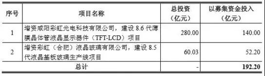 2017年10月16日,彩虹股份對外發(fā)布了《彩虹股份非公開發(fā)行股票發(fā)行情況報告書》。內(nèi)容顯示公司本次非公開發(fā)行股票擬募集資金不超過192.20億元,用于增資咸陽彩虹光電科技有限公司建設(shè)8.6代薄膜晶體管液晶顯示器件(TFT-LCD)項(xiàng)目、增資彩虹(合肥)液晶玻璃有限公司建設(shè)8.5代液晶基板玻璃生產(chǎn)線項(xiàng)目。