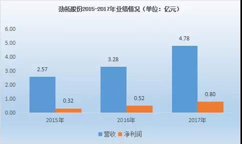 從近年來業(yè)績來看,2015-2017年勁拓股份實現(xiàn)營收分別為2.57億元、3.28億元、4.78億元,同比增長分別為-4.59%、27.60%、45.44%;實現(xiàn)歸屬于上市公司股東的凈利潤分別為0.32億元、0.52億元、0.80億元,同比增長分別為-0.16%、62.64%、54.17%。