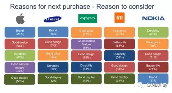 在選擇購(gòu)買各大手機(jī)品牌的理由方面,買蘋果三星的人大多沖著品牌去的,至于買OPPO、小米、諾基亞的人則是看上了它們的價(jià)格厚道。(校對(duì)/羅明)