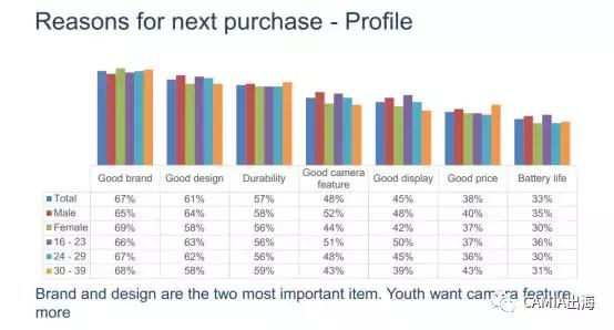 在購(gòu)買手機(jī)考慮的因素方面,大多數(shù)人傾向于手機(jī)品牌與外觀設(shè)計(jì),對(duì)于手機(jī)的拍照,各年齡層次的人都很看重。