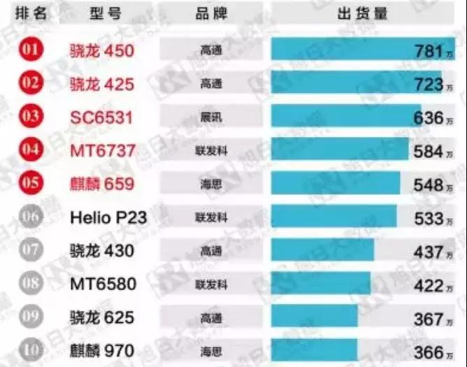 據(jù)旭日大數(shù)據(jù)數(shù)據(jù)顯示,2018年3月手機(jī)CPU市場TOP20型號總出貨量超過7300萬部。其中驍龍450、驍龍425以超過700萬部的出貨量分別排名第一、第二位,展訊功能機(jī)芯片SC6531以636萬部出貨量排名第三。TOP20型號主要來自高通、海思、聯(lián)發(fā)科、展訊4大品牌,其中高通占比近半,聯(lián)發(fā)科占比近3成,此外華為海思也貢獻(xiàn)了超過900萬的出貨量,可見海思系列芯片在華為手機(jī)中占比也越來越大。