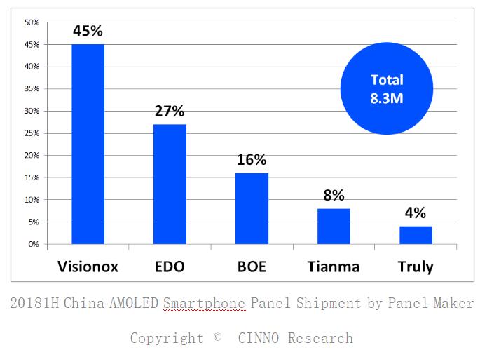 根據(jù)CINNO Research最新報(bào)告,2018年上半年全球智能機(jī)面板出貨6.58億片,其中AMOLED 面板出貨 1.73億片,占比26.3%。
