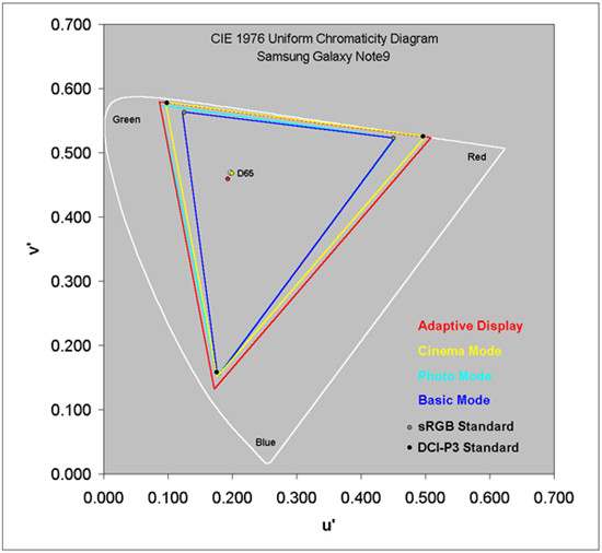 Galaxy Note 9四個(gè)用戶可選的屏幕模式:自適應(yīng)顯示模式、AMOLED電影模式、AMOLED照片和基本屏幕模式。有多個(gè)色域標(biāo)準(zhǔn),包括DCI-P3、Adobe RGB和sRGB/Rec.709,并且有多個(gè)屏幕模式。其中,影院屏幕模式匹配DCI-P3標(biāo)準(zhǔn)色域,基本屏幕模式匹配sRGB/Rec.709標(biāo)準(zhǔn)色域,照片屏幕模式匹配Adobe RGB的色域,自適應(yīng)顯示屏幕模式具有最寬的色域。