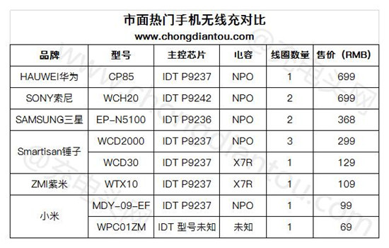 關(guān)于這款產(chǎn)品對(duì)行業(yè)的影響,為了讓大家有個(gè)清晰的了解,充電頭網(wǎng)列舉匯總了市面熱門手機(jī)無線充,包括華為、三星、錘子、索尼、小米、紫米。它們都不約而同的內(nèi)置了美國(guó)IDT主控芯片,不過售價(jià)千差萬別,低至99元,高至699元。而最新的小米無線充做到69元的價(jià)格,對(duì)比以上同類產(chǎn)品,可以發(fā)現(xiàn)它還不到699元最高價(jià)格的十分之一,更是在99元最低價(jià)的基礎(chǔ)上再降30元,再次突破行業(yè)價(jià)格底線。
