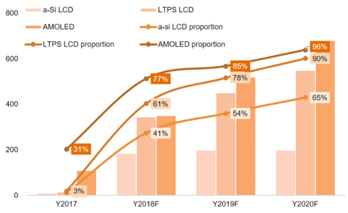 因此,我們預計從2019年起,無開槽全面屏設(shè)計的手機產(chǎn)品將逐漸增多,尤其是在高端產(chǎn)品領(lǐng)域?qū)⒂休^為明顯的增長。而這將對在高端手機領(lǐng)域占有優(yōu)勢的AMOLED面板形成顯著推動作用。根據(jù)群智咨詢的預測,AMOLED面板中異形屏產(chǎn)品的滲透率在2018年達到峰值后在2019年將出現(xiàn)萎縮,無開槽全面屏及開孔全面屏將逐漸蠶食異形全面屏的市場份額。而LTPS LCD及a-Si LCD在未來一段時間內(nèi)異形屏仍是較為經(jīng)濟的顯示解決方案。預計到2020年,LTPS LCD面板產(chǎn)品中異形屏的滲透率將達到68%的水平,而定位較為低端的a-Si LCD面板產(chǎn)品中異形屏的滲透率也將達到39%。