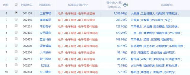 同花順電子制造行業(yè)分類A股上市公司營(yíng)收前10