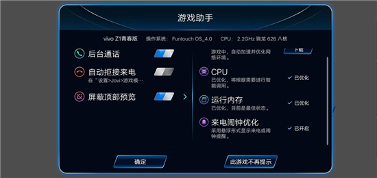 在游戲過程中,為了讓玩家獲得更加沉浸的游戲體驗,vivo Z1青春版提供了游戲免打擾模式,在打開游戲界面時,會自動彈出游戲助手,只需要根據(jù)自身需要設(shè)置,就可以屏蔽第三方應(yīng)用通知,重要來電橫幅顯示,防止消息彈出中斷游戲操作,享受更加專業(yè)和專注的游戲體驗。