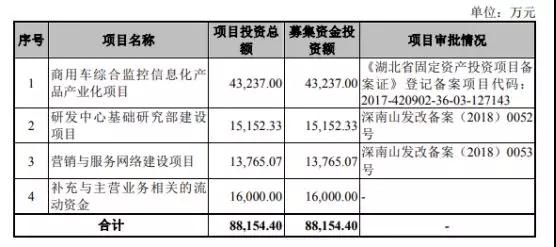 此次,發(fā)行不超過2100萬股,募集資金8.82億元,用于商用車綜合監(jiān)控信息化產(chǎn)品產(chǎn)業(yè)化項目、研發(fā)中心基礎(chǔ)研究部建設(shè)項目、營銷與服務(wù)網(wǎng)絡(luò)建設(shè)項目和補(bǔ)充與主營業(yè)務(wù)相關(guān)的流動資金。