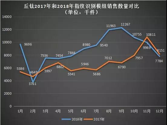 雖然丘鈦科技12月的指紋模組出貨量呈現(xiàn)下滑趨勢,不過公告數(shù)據(jù)顯示,丘鈦科技2018年全年指紋模組銷量高達1.08億件,而2017年指紋模組出貨量為8072.8萬件,由此可見,2018年公司指紋模組整體銷量較2017年有大幅增長。