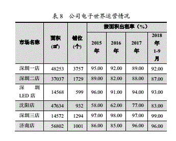 而近年來,華強(qiáng)北“空鋪潮”屢見不鮮。記者從深圳華強(qiáng)集團(tuán)有限公司2018年度第三期中期票據(jù)信用評(píng)級(jí)報(bào)告中發(fā)現(xiàn),華強(qiáng)集團(tuán)的電子世界門店多集中在華強(qiáng)北市場,深圳一店共有鋪位3757個(gè),2015年出租率達(dá)到95%,后逐年下降,2017年降到89%,2018年的1月至9月有所回升,為92%。深圳二店的鋪位數(shù)量為1729個(gè),2018年1至9月出租率為87%。