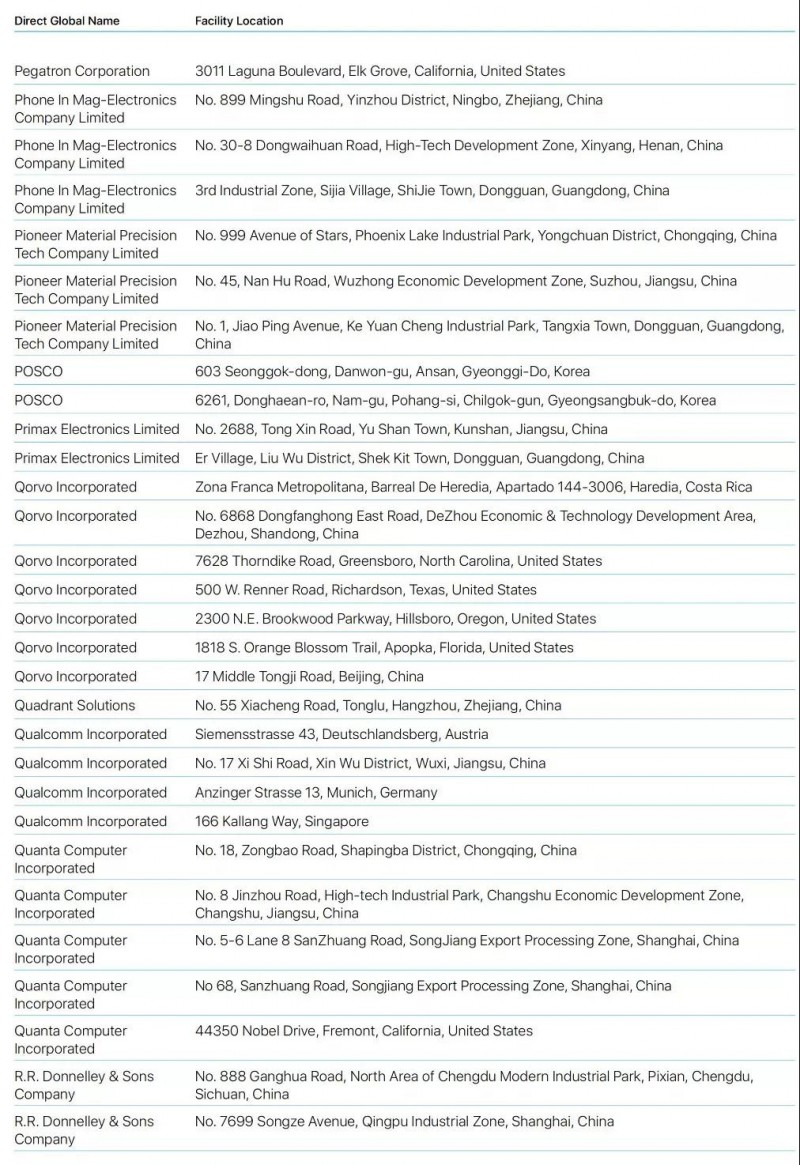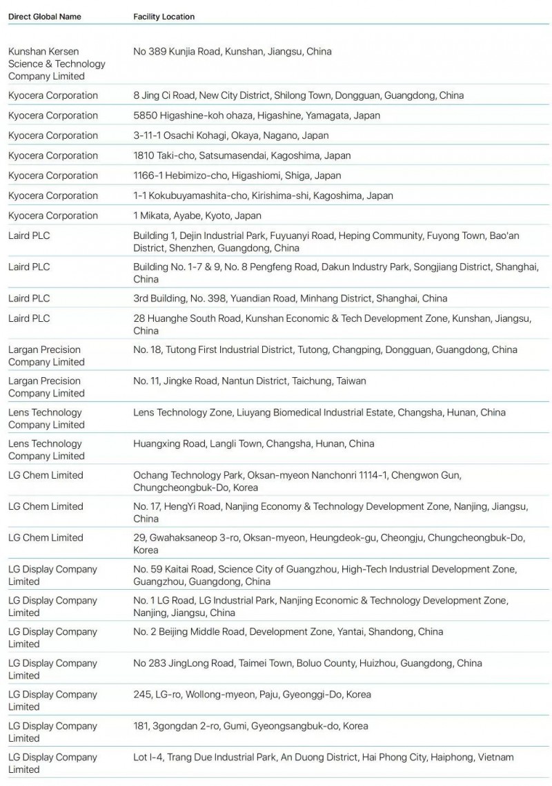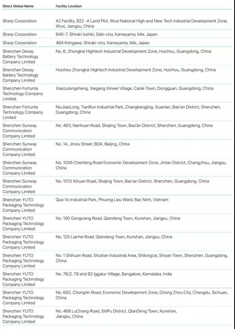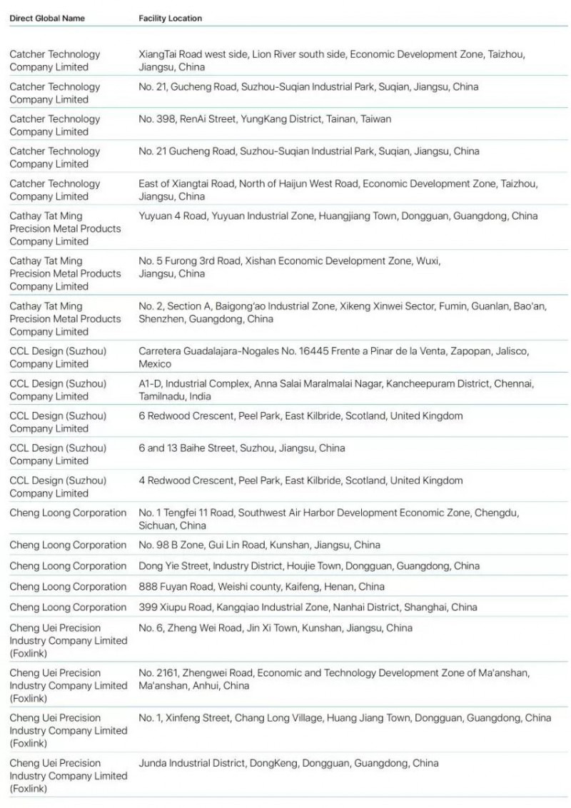Bumchun Precision Company Limited:韓國廠商,此前為蘋果提供音響模塊及其他組件。原部分年份沒有出現(xiàn)在名單中。