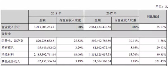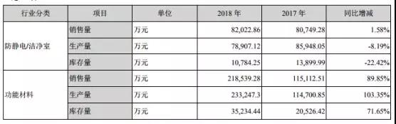 此外,從上述兩種主營產(chǎn)品的銷售量也可以看出,功能材料為業(yè)績增長點所在,其2018年防靜電/潔凈室的生產(chǎn)量與上年同期相比下降8.19%,而功能材料的生產(chǎn)量與上年同期相比則增長了103.35%,起源于則在于收購的千洪電子主營業(yè)務(wù)就是功能材料。