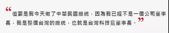 據(jù)郭臺銘這接受《天下雜志》采訪時表示,“現(xiàn)在臺灣臺商回流,我必須要講,是個平庸式的回流。從經(jīng)濟學(xué)上叫比較利益。就是今天我回來,有沒有比較好、比較便宜?但要是我今天當(dāng)選了,因為我已經(jīng)不是一個公司董事長,我是整個臺灣的總統(tǒng),也就是臺灣科技島董事長。”