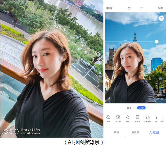 雖然人像占據(jù)了自拍照的大部分面積,畫面背景對(duì)于提升整體成片的質(zhì)感同樣重要。雜亂的背景不僅會(huì)分散視覺注意力,也會(huì)拉低人像的視覺觀感。自拍時(shí)應(yīng)盡量選擇不搶眼的純色背景,或選擇簡約、有美感的環(huán)境進(jìn)行自拍,以襯托人物主體。條件有限時(shí)又想自拍怎么辦?借助后期修圖,用vivo S1 Pro為自拍換一個(gè)漂亮的環(huán)境。點(diǎn)擊相冊編輯功能中的AI摳圖,在百變背景、藝術(shù)畫效果中隨心情選擇,不僅可以一鍵更換場景,也能虛化背景、添加藝術(shù)效果,創(chuàng)意拯救廢片,重新定義影像風(fēng)格。