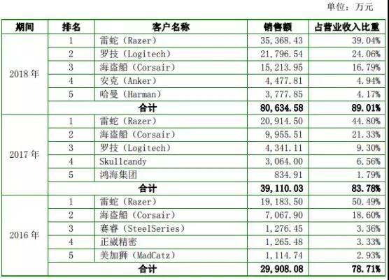 從主營(yíng)業(yè)務(wù)結(jié)構(gòu)來(lái)看,其中耳機(jī)業(yè)務(wù)占據(jù)了絕大部分比例,2016-2018年?duì)I收分別為2.80億元、3.79億元、7.61億元,其次則是麥克風(fēng)業(yè)務(wù),2016-2018年的營(yíng)收分別為4400多萬(wàn)、4100多萬(wàn)、6000多萬(wàn),其三則是音箱業(yè)務(wù),2016年-2018年?duì)I收分別為2064萬(wàn)、1653萬(wàn)、4428萬(wàn)!