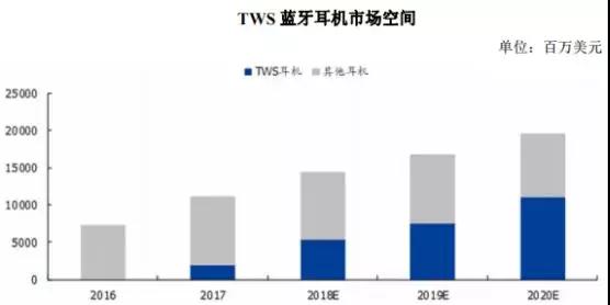 另一方面,蘋果TWS藍(lán)牙耳機(jī)AirPods的成功產(chǎn)生了巨大的示范效應(yīng),各個(gè)耳機(jī)品牌商紛紛加大無(wú)線耳機(jī)產(chǎn)品開發(fā),以TWS藍(lán)牙耳機(jī)產(chǎn)品為代表的無(wú)線耳機(jī)產(chǎn)值迅速增長(zhǎng)。根據(jù)捷孚凱(GFK)在線市場(chǎng)和線下30城市的零售監(jiān)測(cè)數(shù)據(jù)顯示,截至2018年9月,TWS藍(lán)牙耳機(jī)零售額同比增速超630%,2018年1-9月,在線市場(chǎng)零售量達(dá)280萬(wàn)臺(tái),零售額近16億。根據(jù)捷孚凱(GFK)、國(guó)盛證券研究所的預(yù)測(cè),2020年TWS藍(lán)牙耳機(jī)的市場(chǎng)規(guī)模將達(dá)到110億美金。