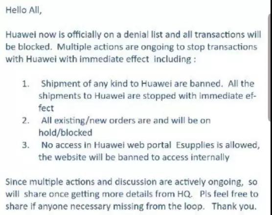 這該事件發(fā)生后,5月17日,朋友圈流傳出美國華為供應(yīng)商的郵件,據(jù)郵件內(nèi)容顯示,要求這些供應(yīng)商禁止與華為合作,包括高通、Intel、格芯(GF)、ARM、安森美、泰瑞達(dá)等公司都已收到郵件,內(nèi)容提到,華為已正式列入被拒名單,所有交易都將被禁止。目前正采取多項(xiàng)行動(dòng)阻止與華為的交易,并將立即生效,包括: