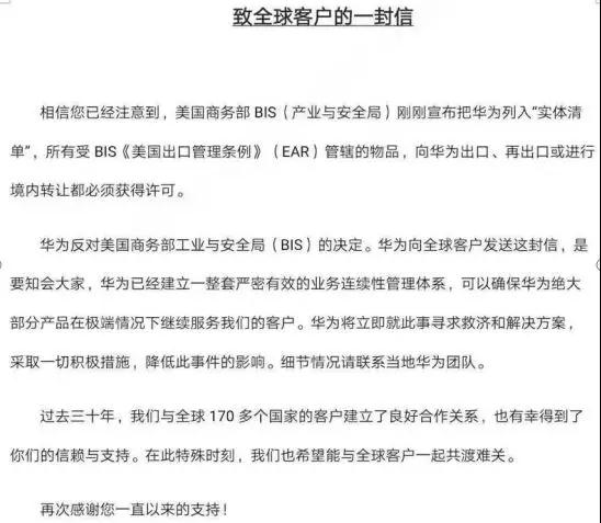 隨后,一封據(jù)稱是華為給客戶的信件顯示:華為反對(duì)美國商務(wù)部工業(yè)與安全局(BIS)的決定。華為向全球客戶發(fā)送這封信,是要知會(huì)大家,華為已經(jīng)建立一整套嚴(yán)密有效的業(yè)務(wù)連續(xù)性管理體系,可以確保華為絕大部分產(chǎn)品這極端情況下繼續(xù)服務(wù)我們的客戶。華為將立即就此事尋求救濟(jì)和解決方案,采取一切積極措施,降低此事的影響。