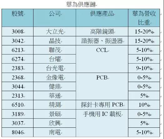 據(jù)瑞信統(tǒng)計(jì),目前與華為有緊密合作關(guān)系的臺(tái)廠,從上游到下游包括大立光、鴻海、臺(tái)積電、晶技、聯(lián)茂、臺(tái)燿、臺(tái)光電、金像電、健鼎、華通、精測、景碩、欣興、南電、聯(lián)發(fā)科、匯頂、聯(lián)詠、敦泰、瑞昱、南亞科、臺(tái)積電、穩(wěn)懋、宏捷科、環(huán)宇-KY、IET-KY、全新、聯(lián)亞、致茂、璟德、臺(tái)達(dá)電、日月光投控、頎邦、京元電、昇達(dá)科、群創(chuàng)、英業(yè)達(dá)、鴻海、工業(yè)富聯(lián)還有大聯(lián)大等。