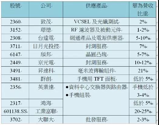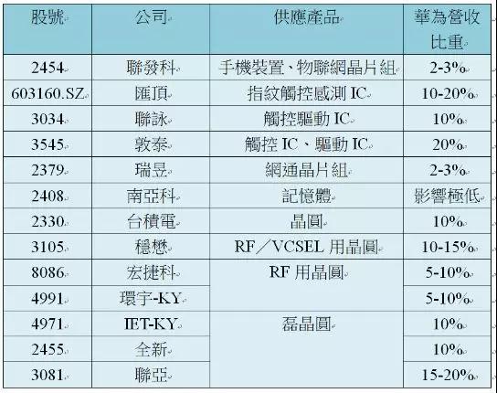 其中營收來自華為比重最高,有大立光、晶技、工業(yè)富聯(lián)、匯頂、聯(lián)亞、敦泰、昇達(dá)科等,最高估計(jì)達(dá)20%,其次聯(lián)茂、臺(tái)燿、臺(tái)光電、精測、南電、京元電、穩(wěn)懋、宏捷科、IET-KY、全新、臺(tái)達(dá)電等,估計(jì)最高比重也有雙位數(shù),臺(tái)積電預(yù)估10%,鴻海低于5%,日月光約7%,而最低是南亞科,影響相當(dāng)有限。