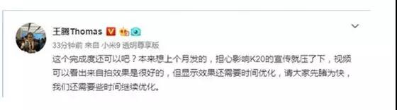 有意思的是,數(shù)小時(shí)后,小米總裁林斌在其微博上公布了小米9屏下攝像頭版,小米公司產(chǎn)品總監(jiān)王騰補(bǔ)充道,這個(gè)視頻本來是想上個(gè)月發(fā)的,擔(dān)心影響K20的宣傳就壓了下,視頻可以看出自拍效果是很好的,但是顯示效果還需要時(shí)間優(yōu)化,請(qǐng)大家先睹為快,我們還需要些時(shí)間繼續(xù)優(yōu)化。