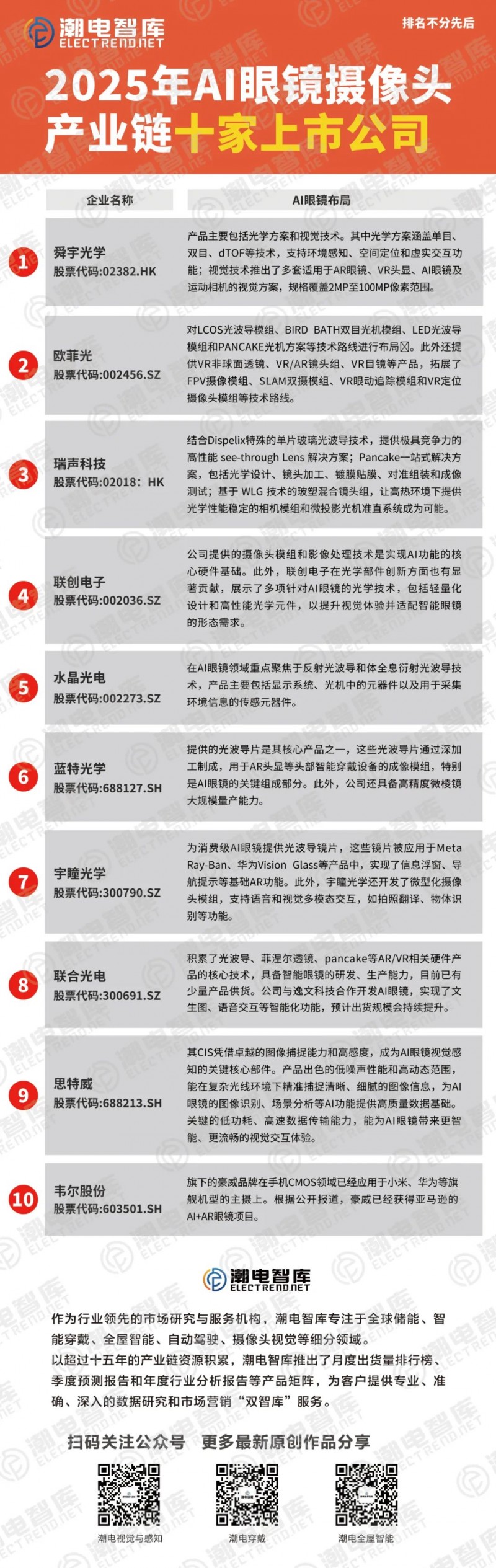 根據(jù)潮電智庫(kù)不完全統(tǒng)計(jì),目前已有舜宇光學(xué)、歐菲光、聯(lián)創(chuàng)電子、水晶光電等光學(xué)力量,加上半導(dǎo)體行業(yè)的思特威、韋爾股份等至少十家上市公司在AI眼鏡業(yè)務(wù)板塊進(jìn)行了相關(guān)的技術(shù)儲(chǔ)備與產(chǎn)品規(guī)劃。