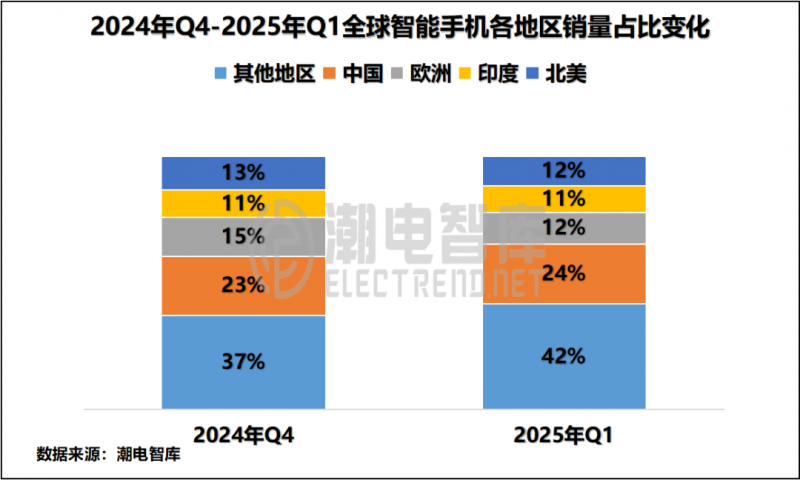 2025年Q1全球智能手機市場同比增長0.3%,市場符合潮電智庫預(yù)測,廠商們?yōu)閼?yīng)對美國政府對中國進口商品加收關(guān)稅增加了產(chǎn)量。