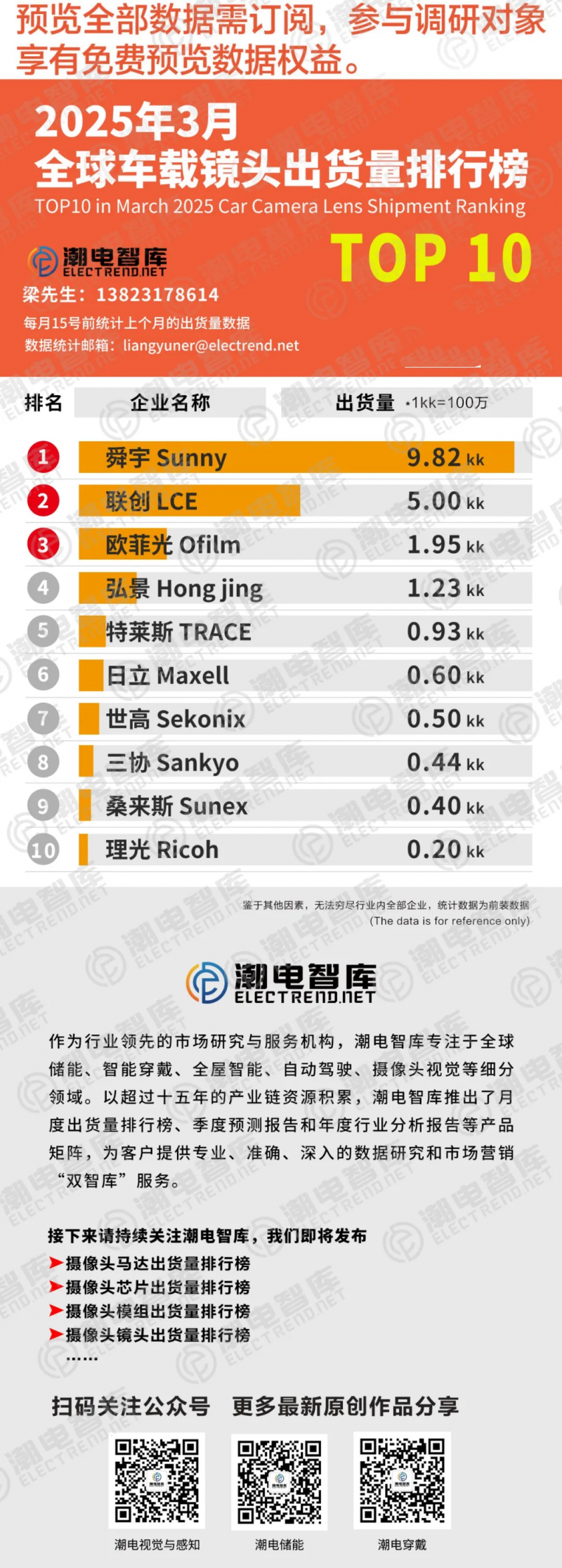 根據(jù)潮電智庫統(tǒng)計(jì),今年3月車載鏡頭TOP 10總出貨量為21.07KK,同比增長25%。其中聯(lián)創(chuàng)電子增量近一倍,國產(chǎn)車載鏡頭廠商平均增速超過30%,歐菲光、聯(lián)創(chuàng)電子、弘景光電、特萊斯等廠商均已獲得國產(chǎn)新勢力多個(gè)定點(diǎn)項(xiàng)目訂單。