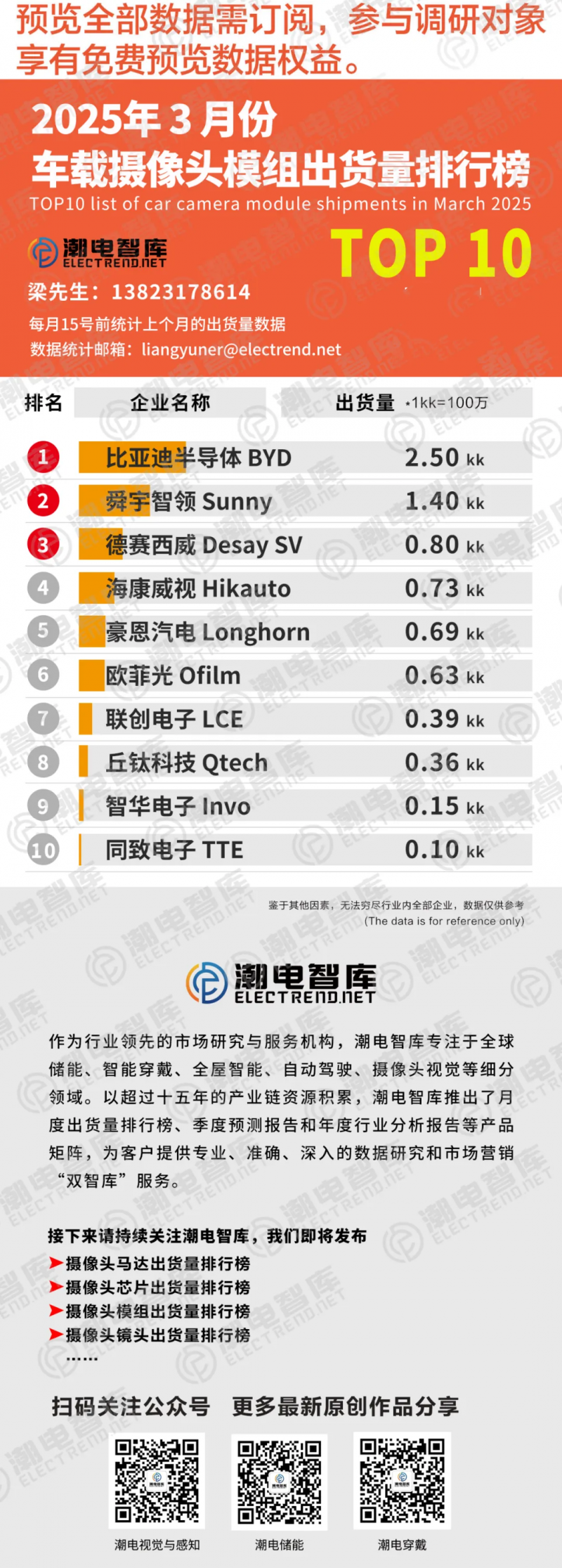 根據(jù)潮電智庫數(shù)據(jù)統(tǒng)計顯示,2025年3月車載攝像頭模組出貨量TOP10總量為7.75KK。其中比亞迪半導體直接受益“天神之眼”,增長迅速,單月出貨量超過2KK。
