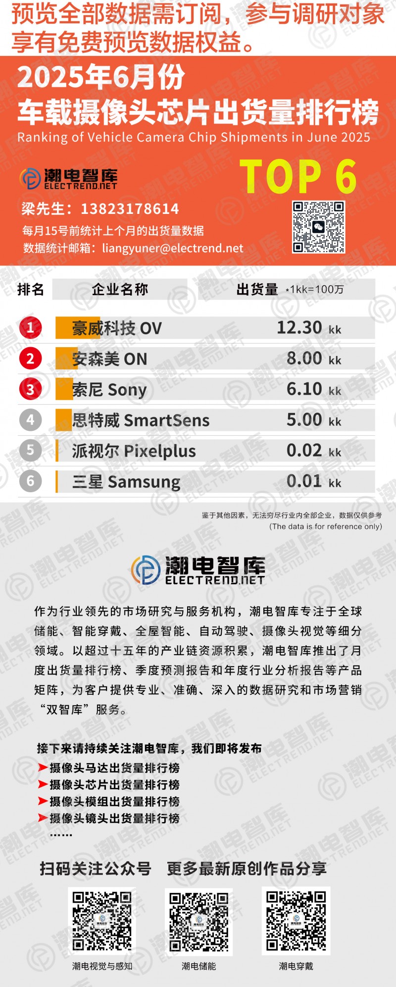 6月車載攝像頭CMOS芯片TOP6出貨量為31.43KK,值得注意的是由于安森美的戰(zhàn)略布局,國產前視ADAS市場擁入豪威、思特威、索尼等廠商,且均以獲得定點項目。
