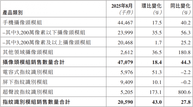 9月8日,丘鈦科技在港交所發(fā)布公告稱,8月攝像頭模組銷售數(shù)量合計為4,707.9萬顆,同比增長44.3%。