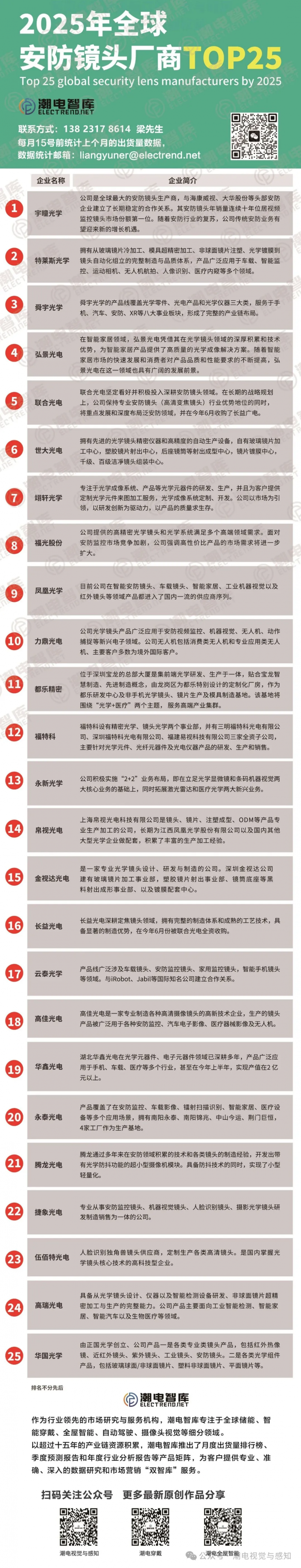 為此潮電智庫(kù)進(jìn)行走訪調(diào)研市場(chǎng),整理出了目前主流25家安防鏡頭廠商,我們也計(jì)劃將安防鏡頭月度出貨量榜單廠商進(jìn)行更新,因鏡頭市場(chǎng)較為細(xì)分,歡迎未統(tǒng)計(jì)上榜廠商,聯(lián)系潮電智庫(kù)進(jìn)行補(bǔ)充。