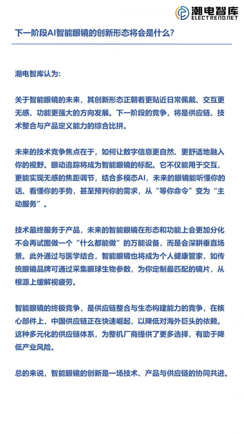 潮電智庫(kù)認(rèn)為:關(guān)于智能眼鏡的未來(lái),其創(chuàng)新形態(tài)正朝著更貼近日常佩戴、交互更無(wú)感、功能更強(qiáng)大的方向發(fā)展。下一階段的競(jìng)爭(zhēng),將是供應(yīng)鏈、技術(shù)整合與產(chǎn)品定義能力的綜合比拼。