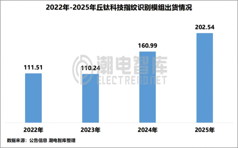 指紋識(shí)別模組產(chǎn)品方面,丘鈦科技2025年銷量約2.03億顆,同比增長25.8%。其創(chuàng)新的國產(chǎn)超聲波指紋識(shí)別模組產(chǎn)品增長勢頭強(qiáng)勁,行業(yè)滲透率持續(xù)提升,2025年全年丘鈦科技超聲波指紋識(shí)別模組銷量約4155萬顆,同比增長近4倍,占公司整個(gè)指紋識(shí)別模組銷量的比例更是從2024年度的5.3%提升至2025年度的20.5%。