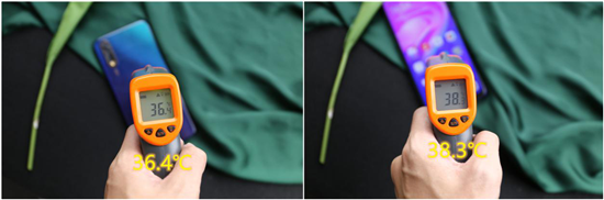 另外還發(fā)現(xiàn)一個(gè)有趣的問題,vivo Y7s在長時(shí)間充完電或重度耗電后,并未出現(xiàn)燙手情況。在用紅外線溫槍測(cè)試了下機(jī)型正面及背面溫度,其中背面溫度為36.4℃,正面相對(duì)較高在38.3℃,這點(diǎn)表現(xiàn)也令人滿意。