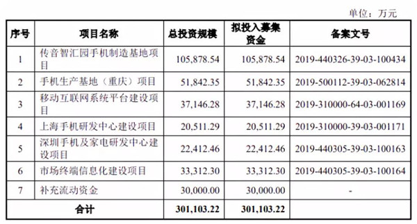 此次起計(jì)劃發(fā)行不低于8000萬(wàn)股,展發(fā)行后股本的比例不低于10%,總計(jì)募集資金30.11億元,其中傳音智匯園手機(jī)制造基地項(xiàng)目總投資10.58億元,手機(jī)生產(chǎn)基地(重慶)項(xiàng)目總投資5.18億元,移動(dòng)互聯(lián)網(wǎng)系統(tǒng)平臺(tái)建設(shè)項(xiàng)目總投資3.71億元,上海手機(jī)研發(fā)中心建設(shè)項(xiàng)目總投資2.05億元,深圳手機(jī)及家電研發(fā)中心建設(shè)項(xiàng)目總投資2.24億元,市場(chǎng)終端信息化建設(shè)項(xiàng)目總投資3.33億元,補(bǔ)充流動(dòng)資金3億元,合計(jì)為30.11億元!