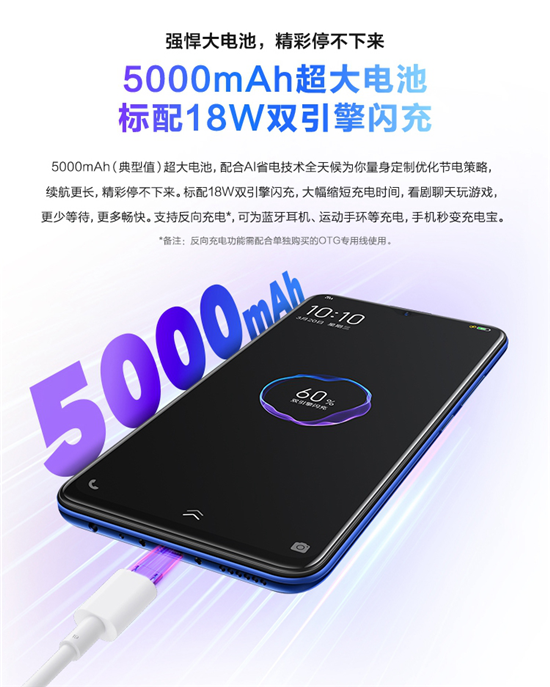 在配備容量電池加持的同時(shí),vivo U3配備了18W雙引擎閃充,充電速度更快,等待時(shí)間更短,能夠大大縮減你的充電時(shí)間,享受更暢快的生活。vivo U3還支持反向充電,可為藍(lán)牙耳機(jī)、智能手環(huán)等設(shè)備進(jìn)行充電,變身隨身的充電寶。