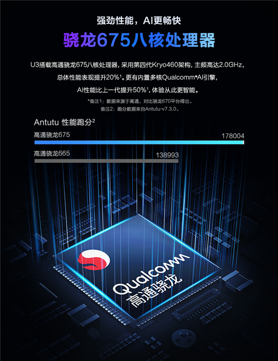性能上,vivo U3搭載了高通驍龍675八核處理器,主頻達(dá)2.0GHz。驍龍675采用11nm制程工藝,擁有與驍龍8系相同的Kryo460架構(gòu),總體性能提升了20%,擁有強(qiáng)勁性能的同時(shí),功耗也更低。此外,AI性能更是比上一代大幅提升超了50%,帶來更智能的用機(jī)體驗(yàn)。
