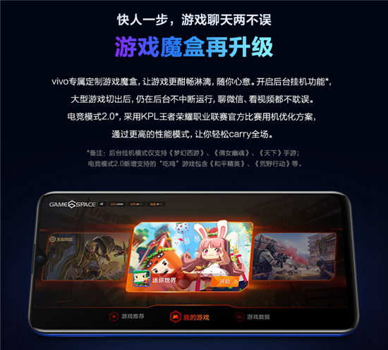 針對(duì)游戲,vivo U3還加入了全新升級(jí)的游戲魔盒,帶來專業(yè)級(jí)的游戲體驗(yàn)。開啟后臺(tái)掛機(jī),切換到其他應(yīng)用時(shí),游戲仍然能夠在后臺(tái)運(yùn)行不中斷。在電競(jìng)模式2.0上,vivo U3以KPL賽事用機(jī)的優(yōu)化方案,帶來更高效的性能模式,在游戲中火力全開。