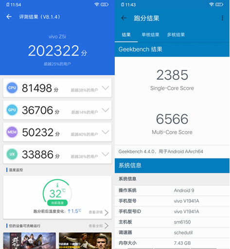 vivo Z5還配備了8GB LPDDR4X雙通道大運存,以及128GB大儲存空間,同時采用三卡槽設(shè)計,最高支持256GB的內(nèi)存擴展。從跑分數(shù)據(jù)來看,vivo Z5i安兔兔跑分達到20萬,在Geekbench上,單核得分2385,多核得分6566分,性能十分強勁。