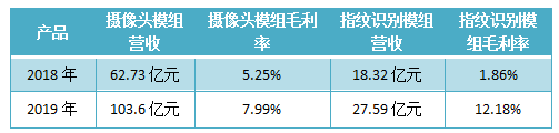 在產(chǎn)品毛利率上,經(jīng)過計(jì)算,2019年丘鈦科技攝像頭模組毛利率約為7.99%,較去年同期的5.25%增加2.74個(gè)百分點(diǎn);指紋識別模組毛利率約為12.18%,較去年同期的1.86%增加10.32個(gè)百分點(diǎn)。