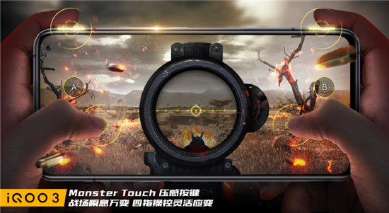 最值得一提的是,iQOO 3上延續(xù)了廣受好評(píng)的Monster Touch壓感按鍵:通過手機(jī)側(cè)邊框上的兩個(gè)壓感按鍵,與屏幕上自定義的位置實(shí)現(xiàn)映射,幫助用戶在游戲中實(shí)現(xiàn)快捷的多指操作。用戶可以在吃雞游戲中,實(shí)現(xiàn)邊移動(dòng)邊開槍;在王者榮耀中,實(shí)現(xiàn)快速換裝備等按鍵操作體驗(yàn)。在加強(qiáng)按鍵質(zhì)量更穩(wěn)定更可靠的同時(shí),增加用戶在游戲過程中的趣味性。